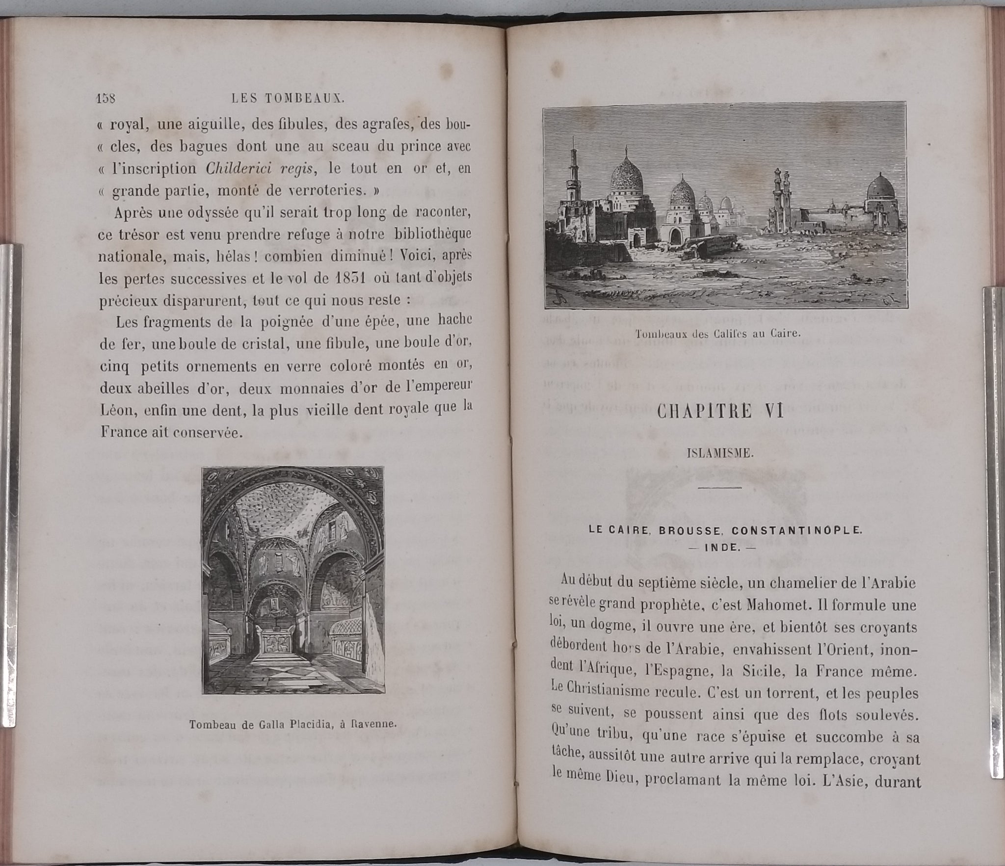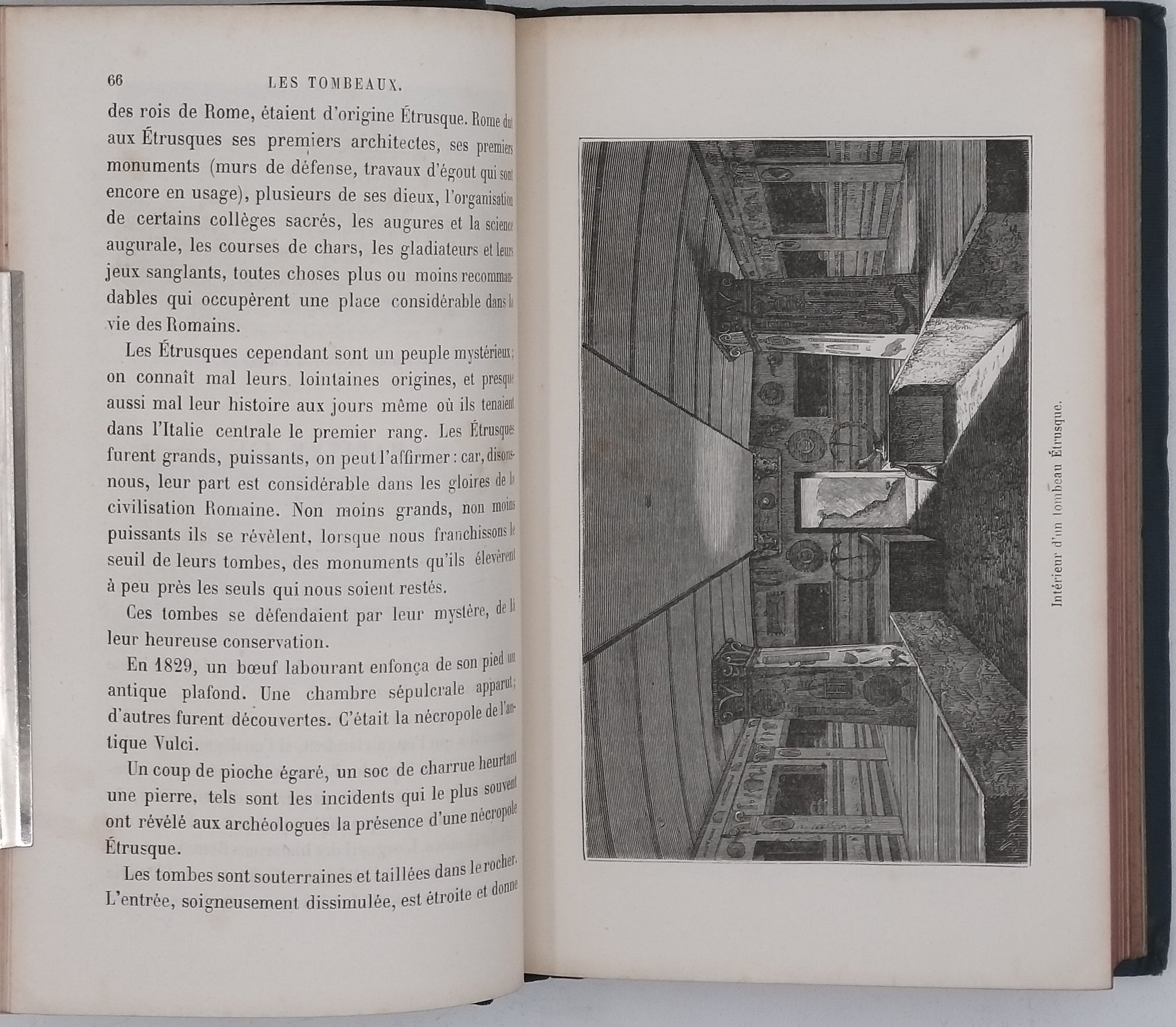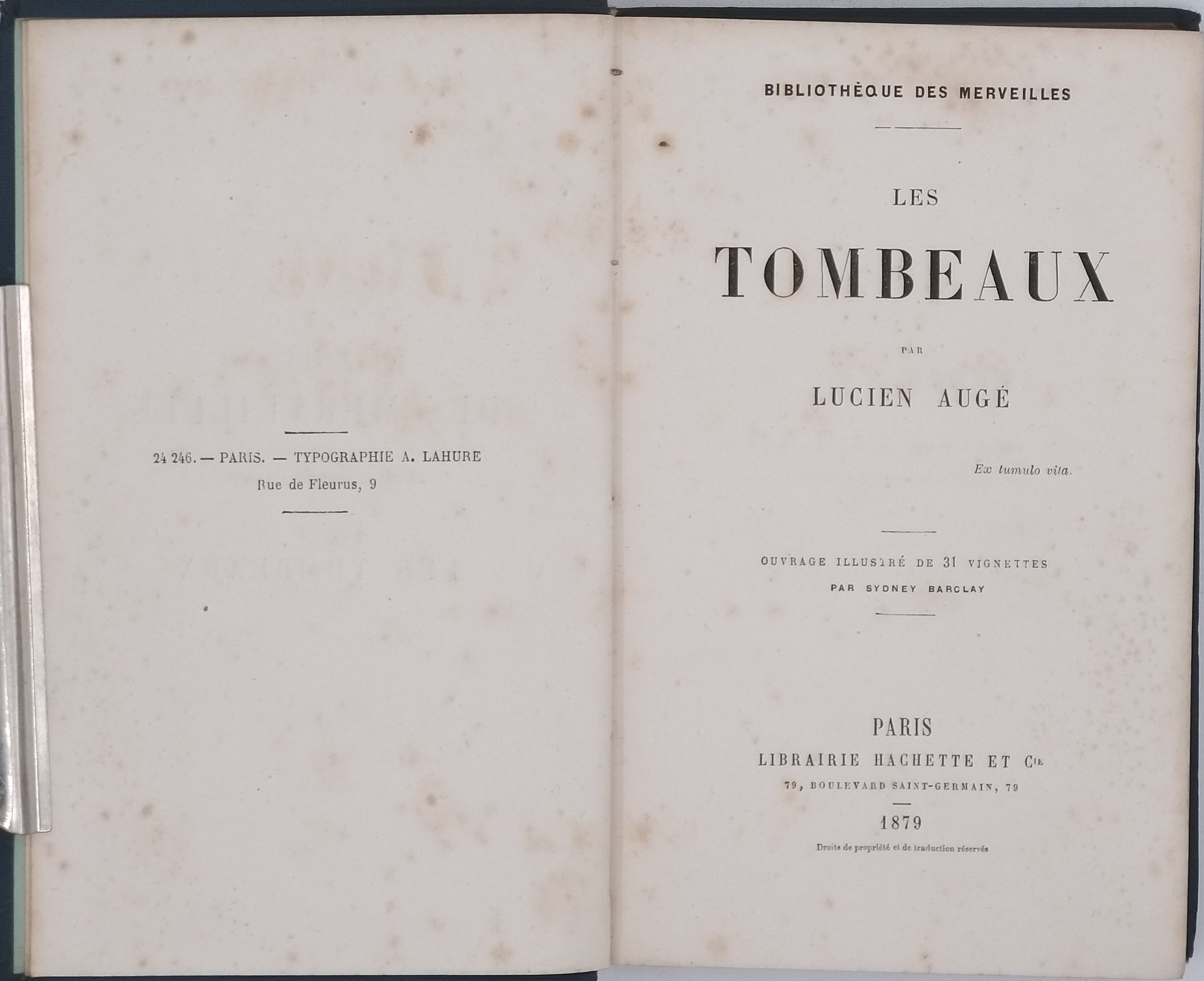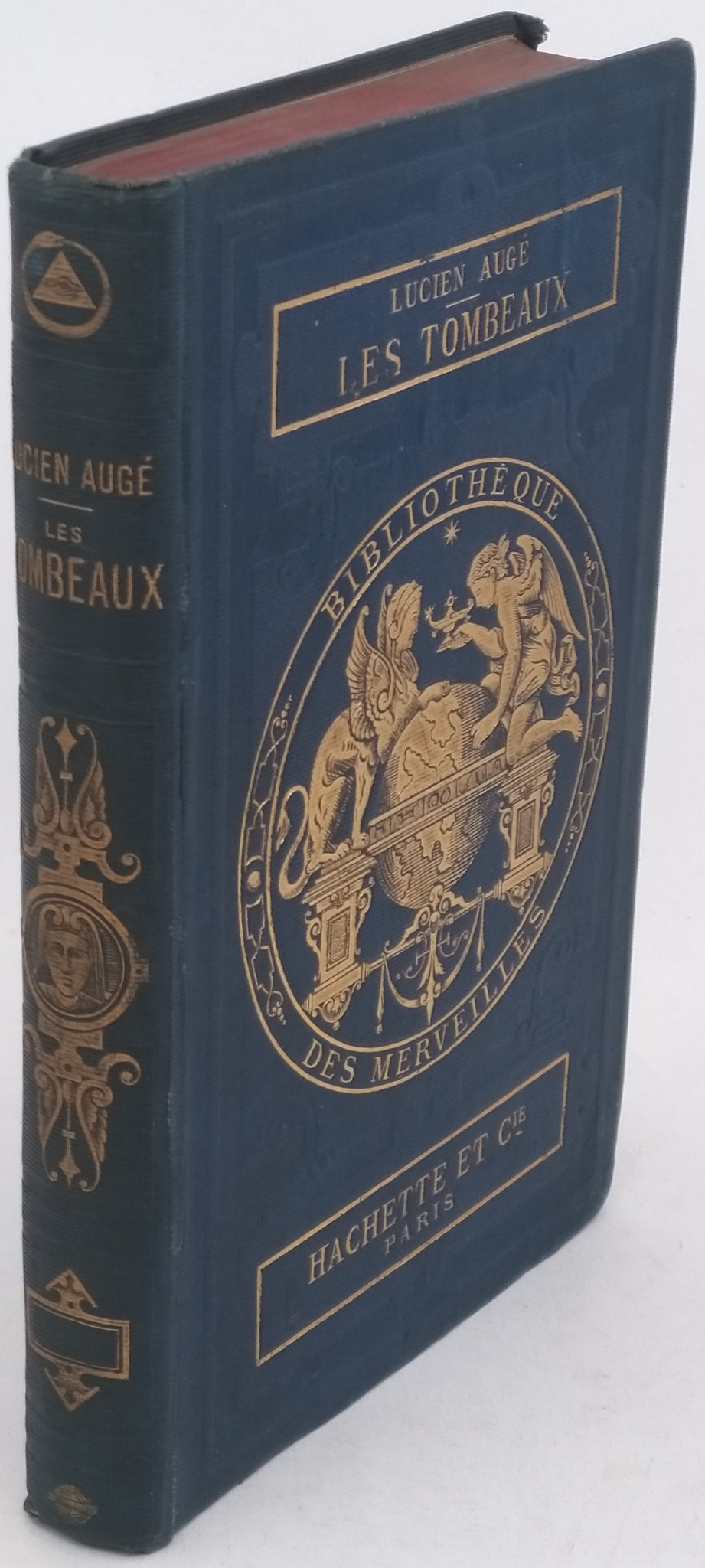 in-12 (12 x 18 cm). Pleine percaline bleue de l'éditeur. Reliure typique de la Collection Bibliothèque des Merveilles avec des plats estampées d'or : un Sphinx et un personnage ailé au dessus d'un globe terrestre au premier plat et des instruments scientifiques au deuxième plat. Dos lisse avec ornements dorés (dont un œil dans un triangle entouré d'un serpent qui se mord la queue -symbole maçonnique-) et titre doré. Un frottement au deuxième plat le long du mors ; malgré cela reliure en bel état. Toutes tranches rouges. II pages (Préface), 302 pages, 1 page de Table et 8 pages de catalogue de l'éditeur non chiffrées in-fine. 31 gravures de tombeaux en noir par Sydney Barclay dont certaines à pleine page. Des rousseurs éparses. Bel exemplaire malgré les défauts signalés.