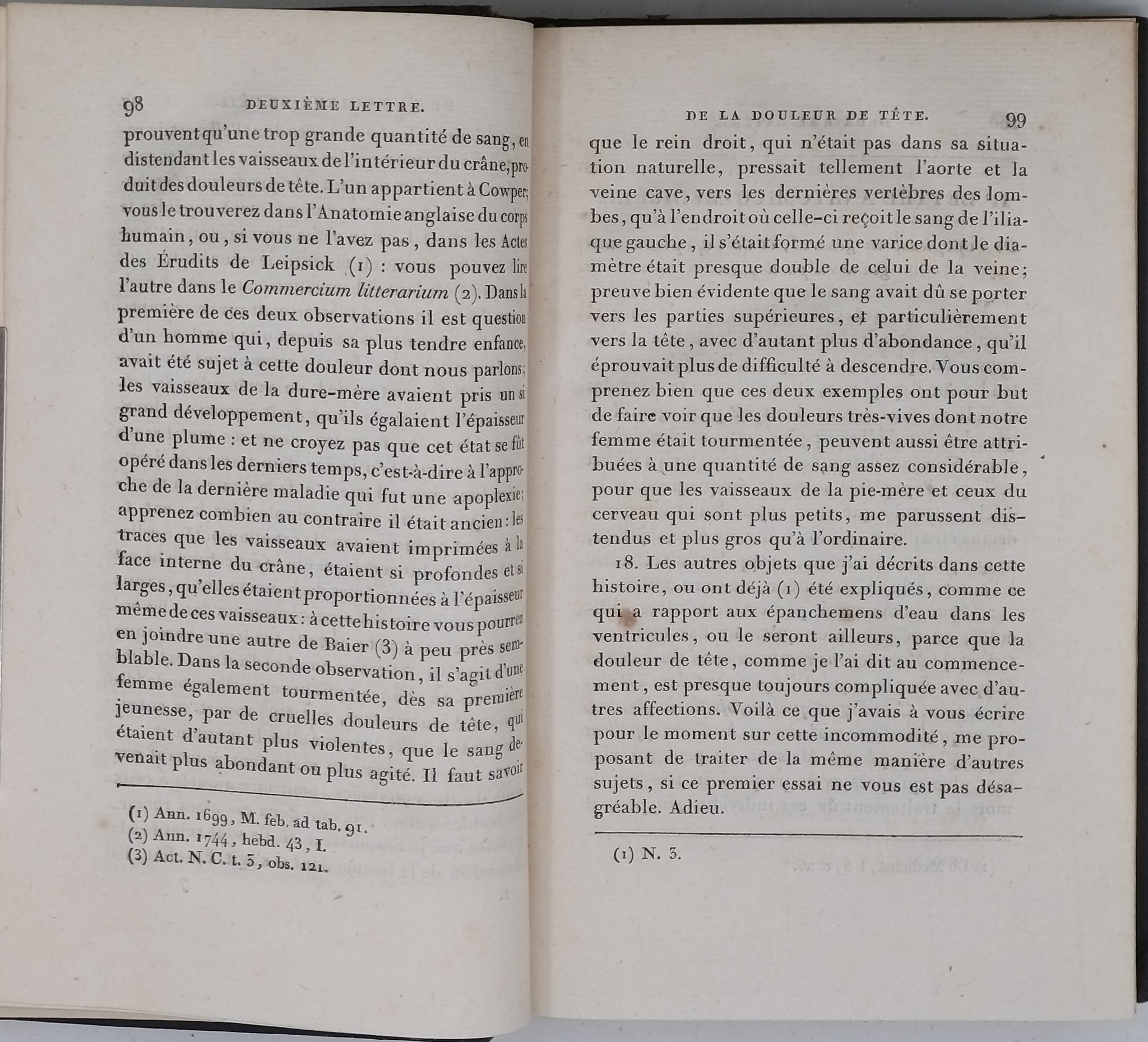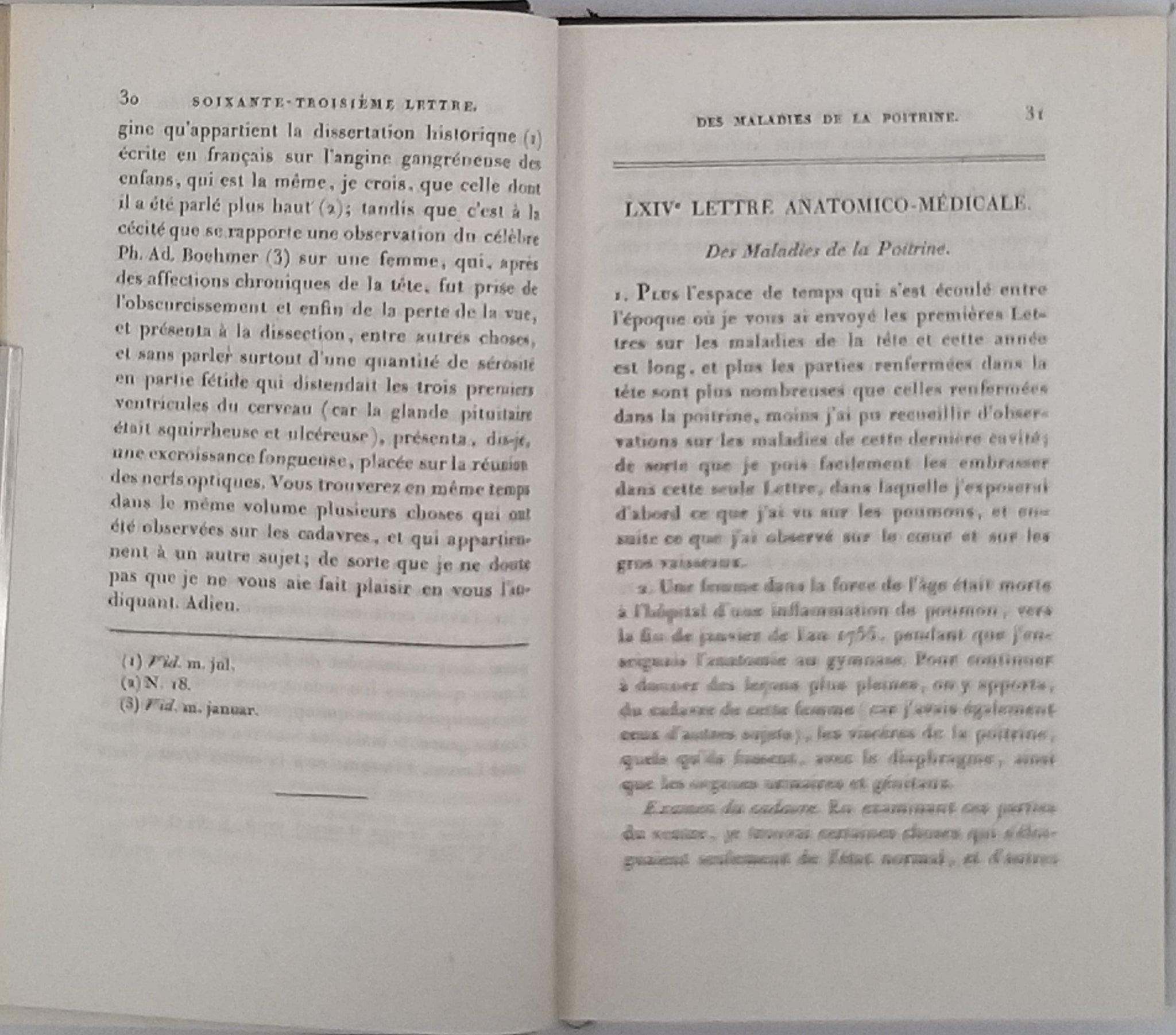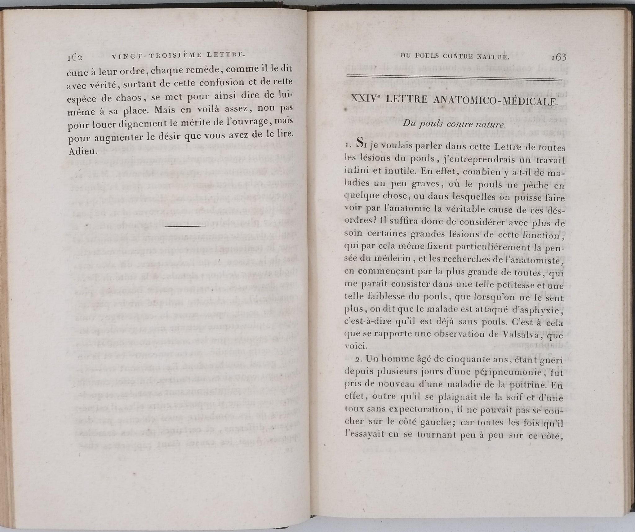 Volume II : 1821. 2 feuillets non chiffrés (Faux titre et Titre), 591 pp., 1 page non chiffrée (Table). Contient : les Lettres Anatomico-médicales de IX à XIV, Livre Second - Des maladies de la poitrine, Épître dédicatoire à Guillaume Bromfield, Lettres Anatomico-médicales de XV à XVI.