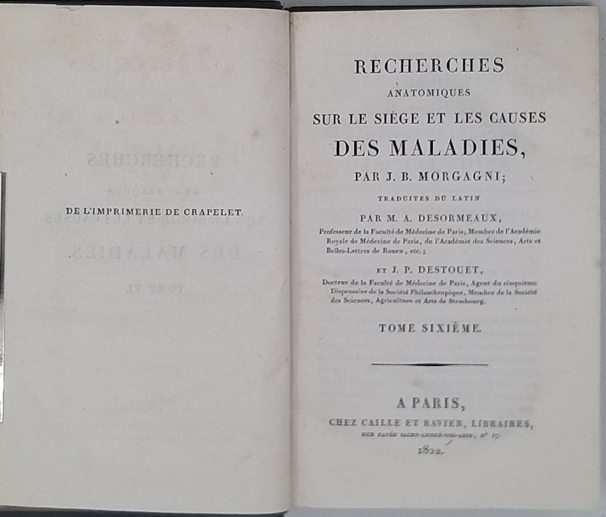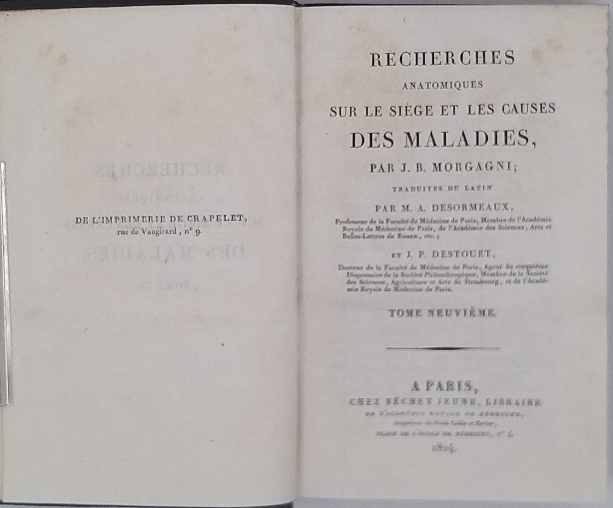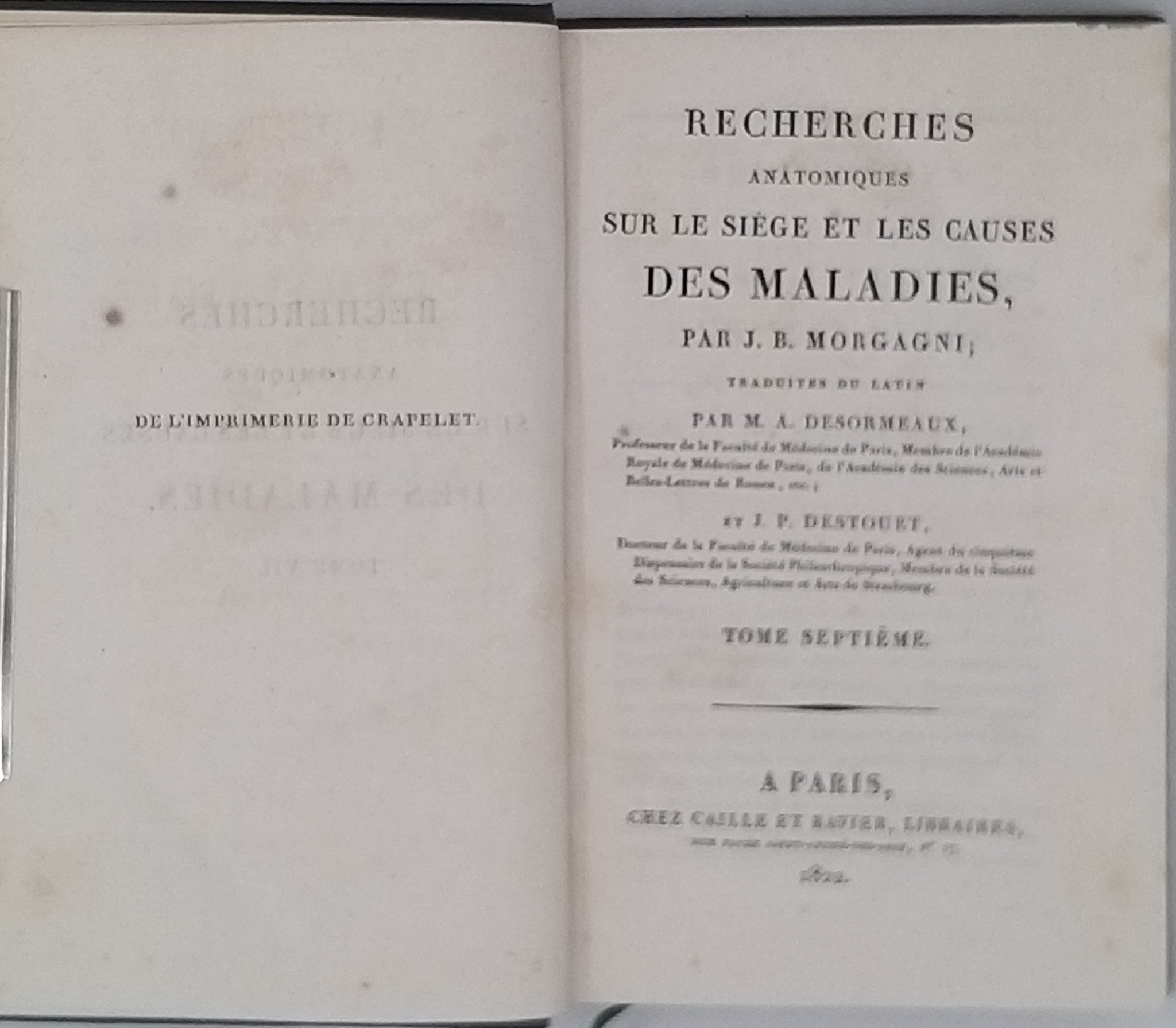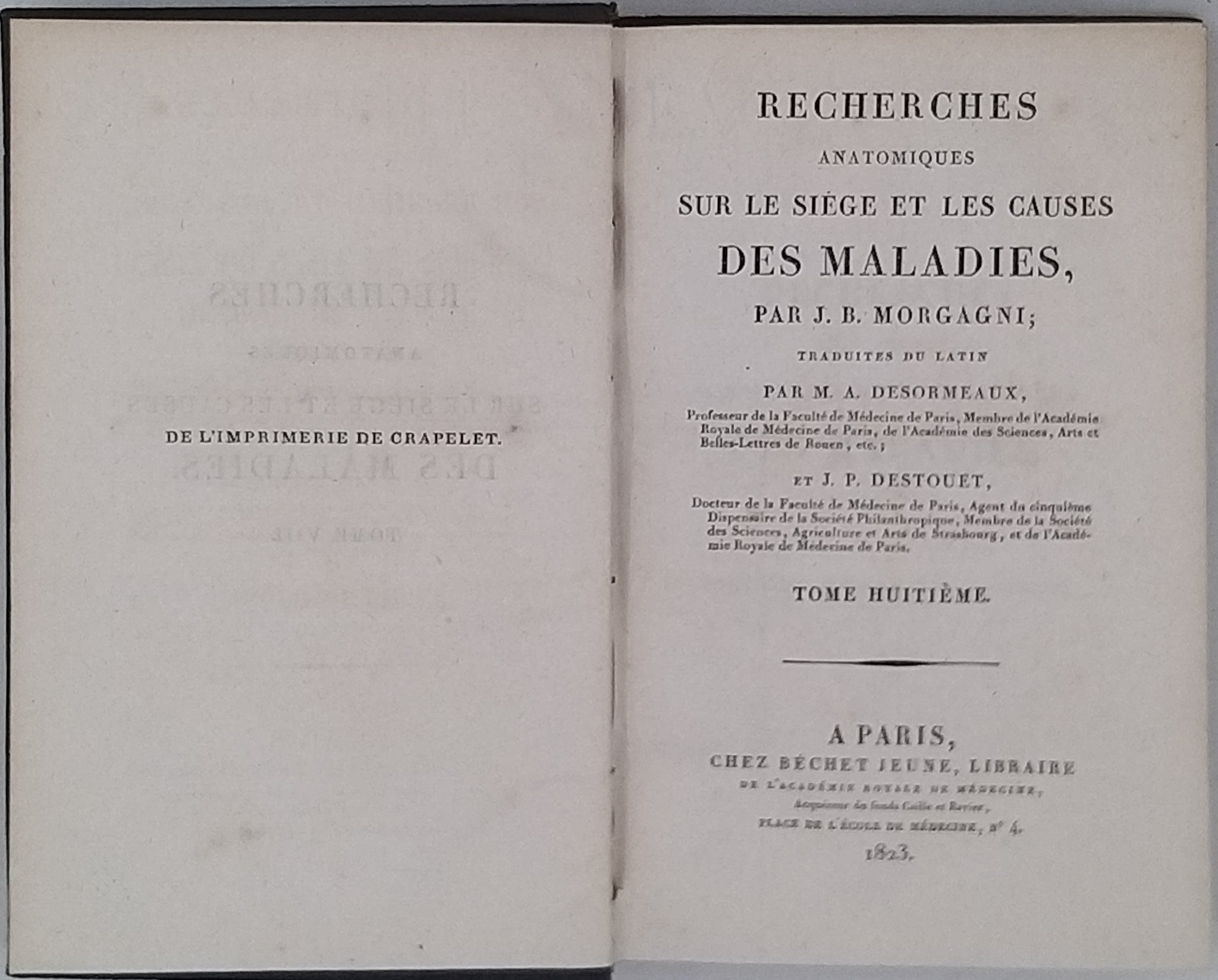 Volume 1 : 1820. XII pp. (Faux titre, Titre, Avant-propos des traducteurs), 536 pp., 1 feuillet non chiffré (Table et Errata). Contient : Avant-propos des traducteurs, Notice sur la vie de Morgagni par Tissot, Préface et les Lettres Anatomico-médicales de I à VIII.