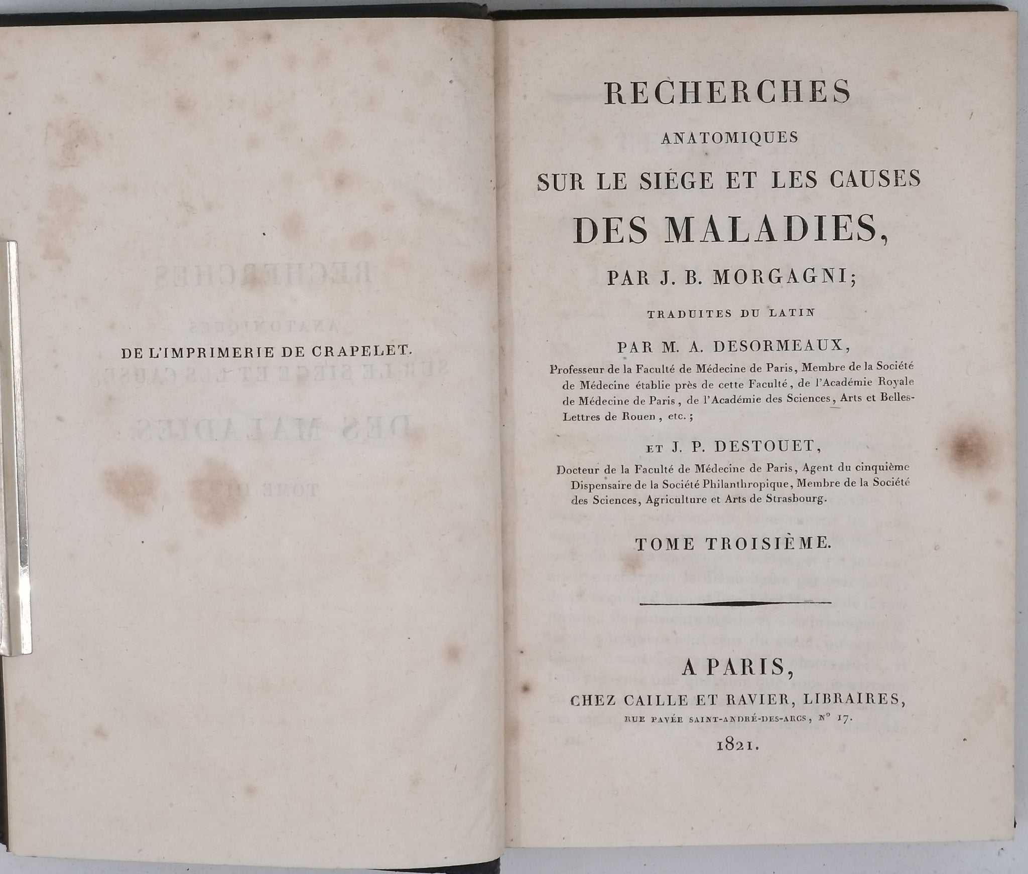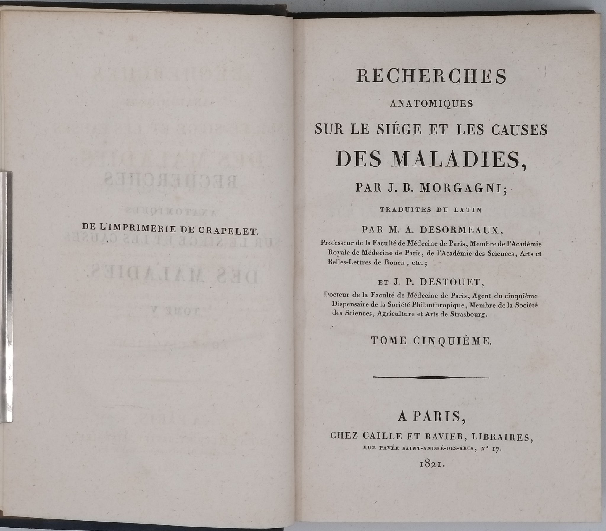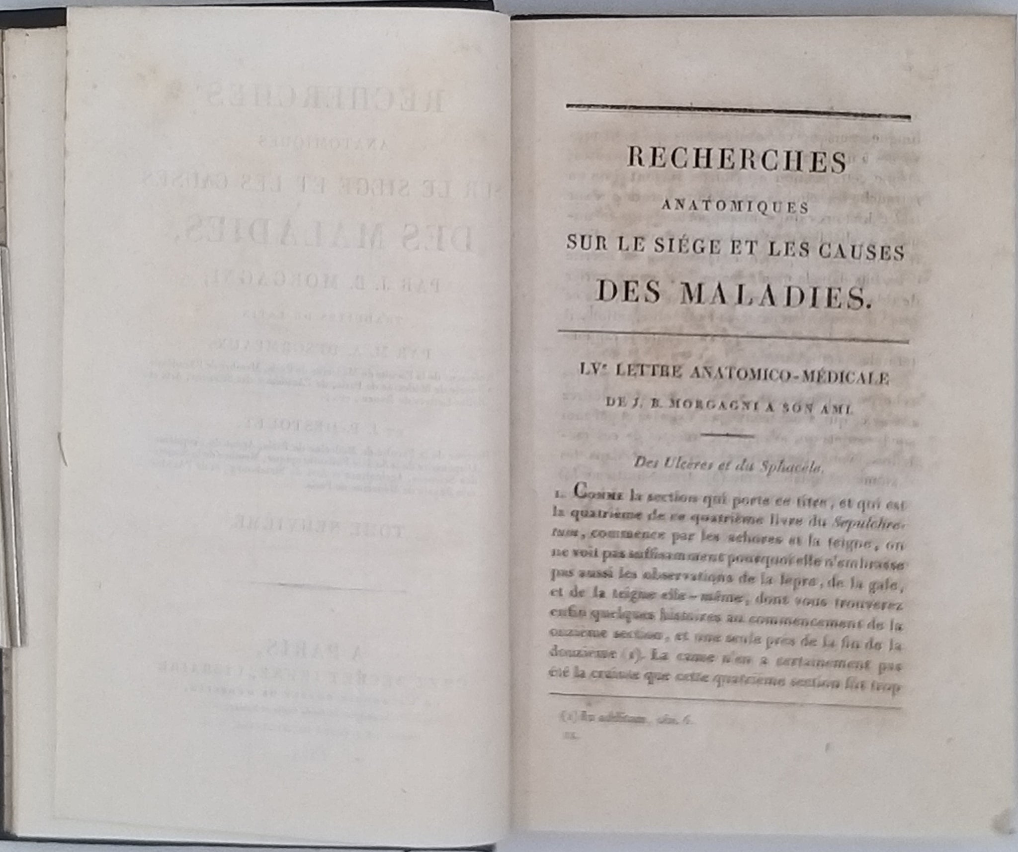 Volume 1 : 1820. XII pp. (Faux titre, Titre, Avant-propos des traducteurs), 536 pp., 1 feuillet non chiffré (Table et Errata). Contient : Avant-propos des traducteurs, Notice sur la vie de Morgagni par Tissot, Préface et les Lettres Anatomico-médicales de I à VIII.