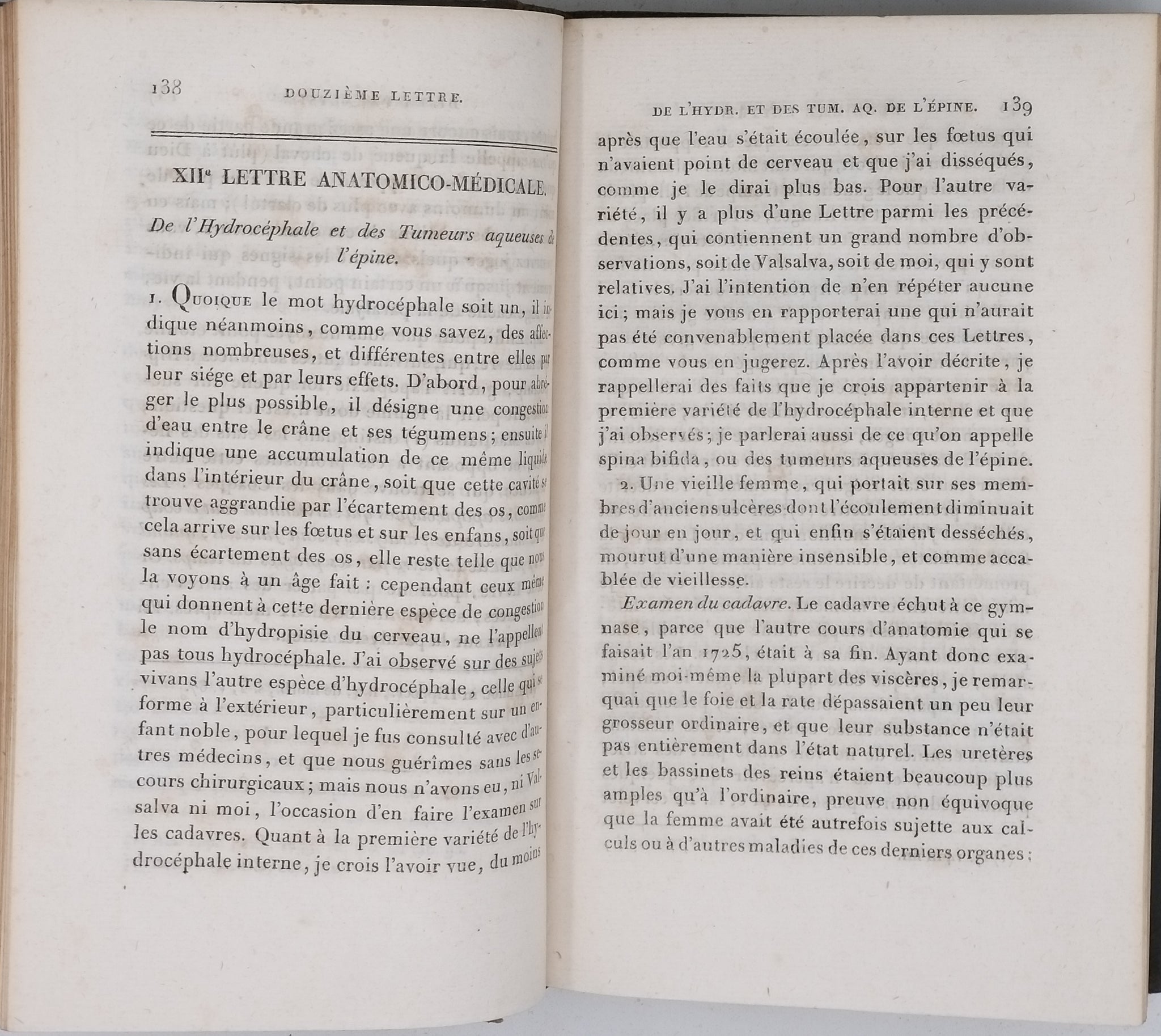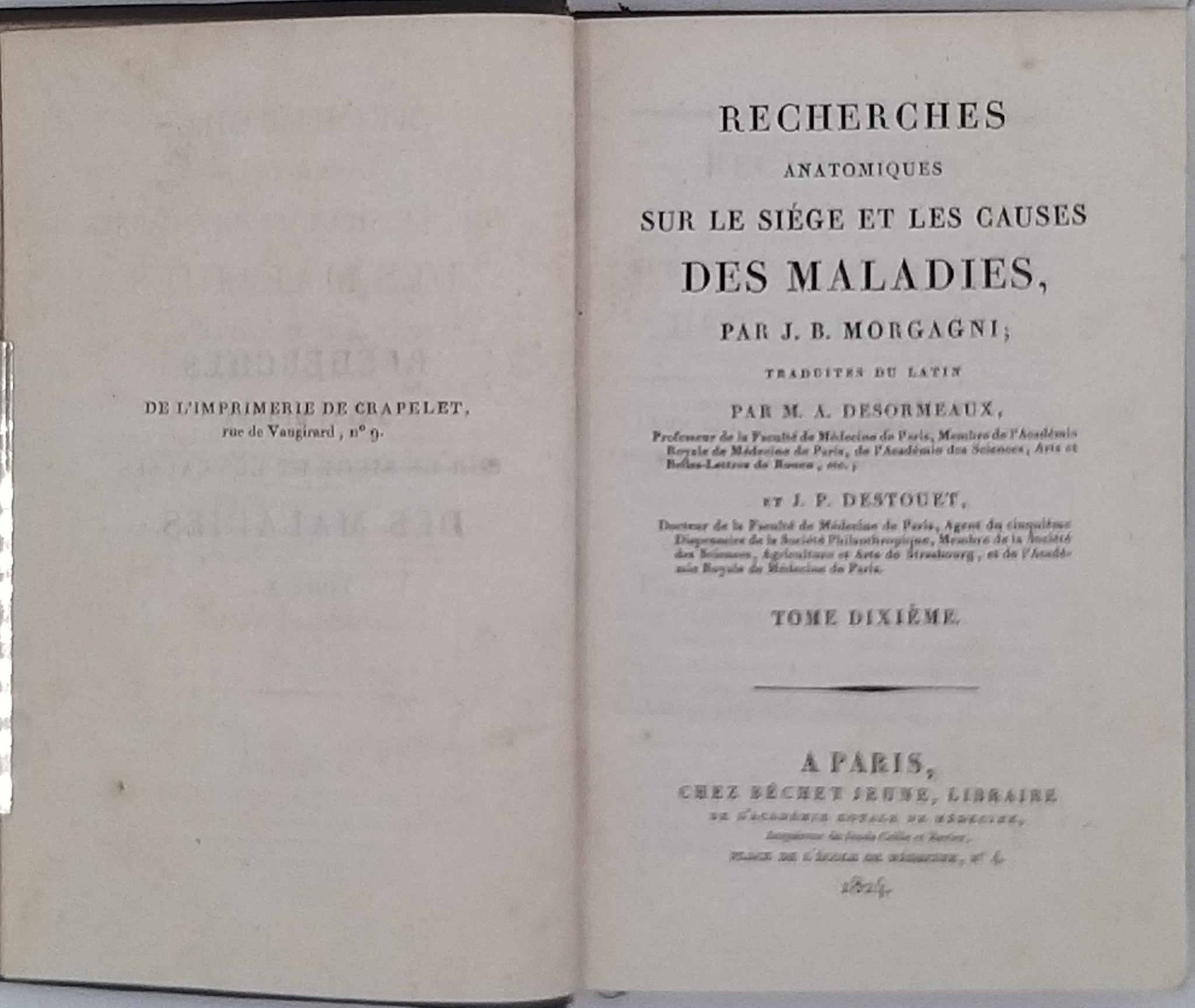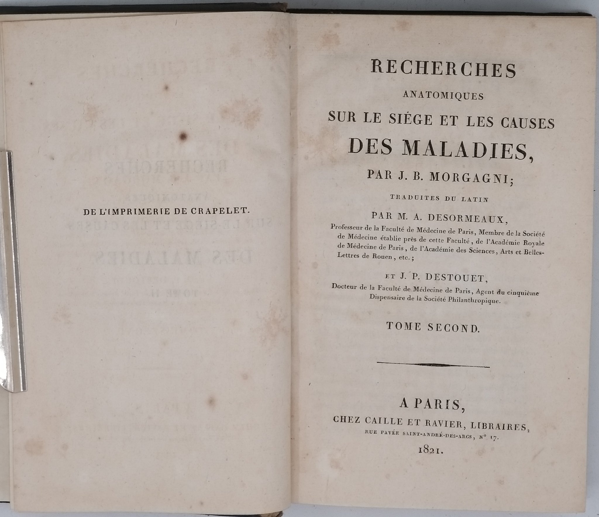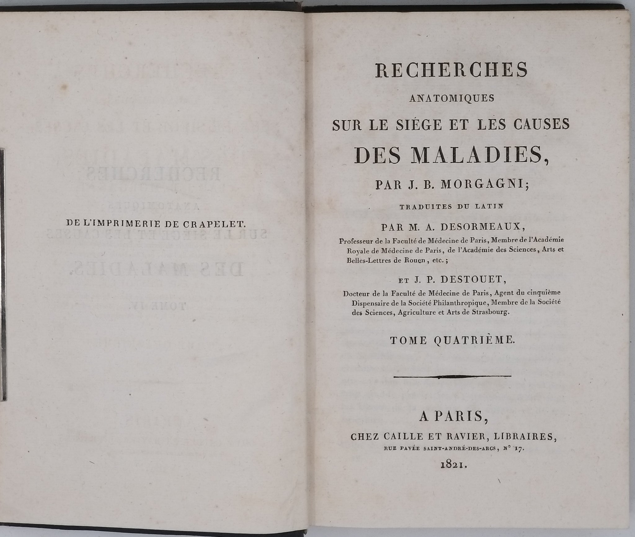 Volume 1 : 1820. XII pp. (Faux titre, Titre, Avant-propos des traducteurs), 536 pp., 1 feuillet non chiffré (Table et Errata). Contient : Avant-propos des traducteurs, Notice sur la vie de Morgagni par Tissot, Préface et les Lettres Anatomico-médicales de I à VIII.