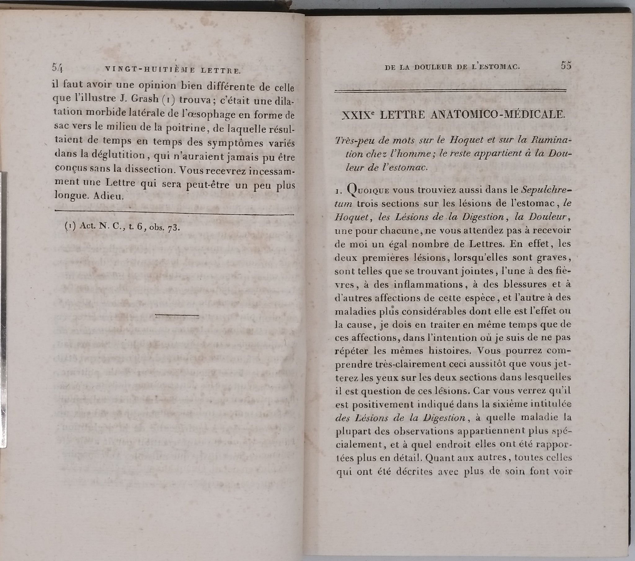 Volume VI : 1822. 2 feuillets non chiffrés (Faux titre et Titre), 638 pp., 1 feuillet non chiffré (Table et Errata). Contient : les Lettres Anatomico-médicales de XXXVIII à XLII.