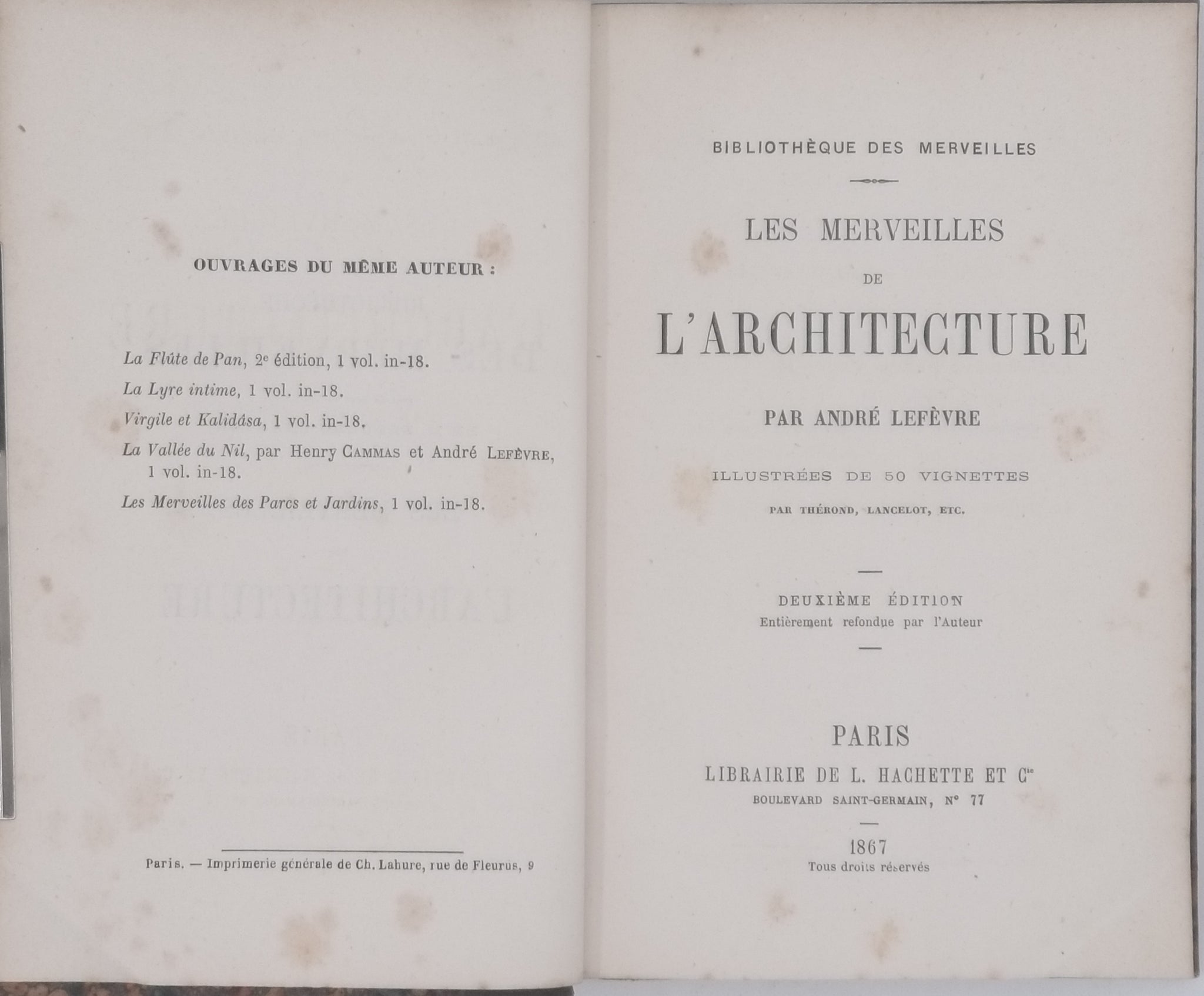 Éditeur : Librairie L. Hachette et Cie, Paris, 1867. Collection Bibliothèque des Merveilles. Deuxième édition.