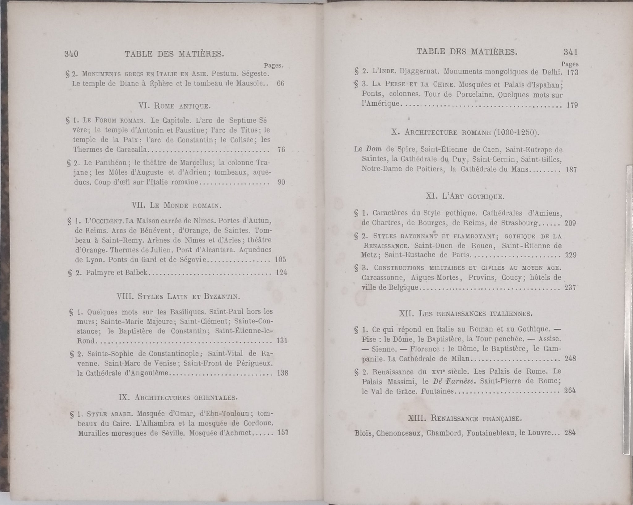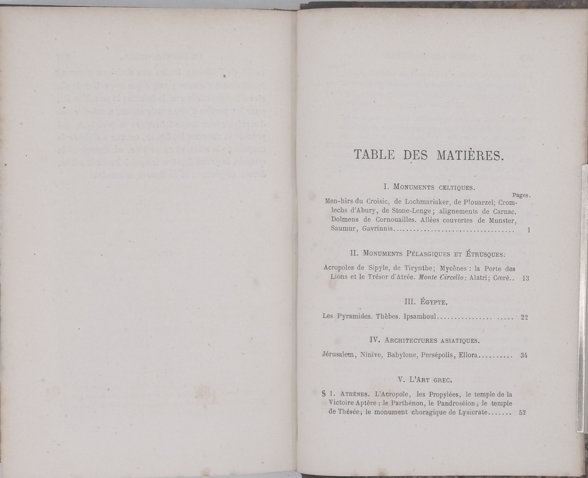 Ouvrage en XIV chapitres décrivant les architectures historiques depuis l'Antiquité jusqu'à la Renaissance et l'art moderne : I. Monuments celtiques. II. Monuments Pélasgiques et Étrusques. III. Égypte juive. IV. Architectures asiatiques. V. L'art grec. VI. Rome antique. VII. Le monde romain. VIII. Style latins et byzantins. IX. Architectures orientales. X. Architecture Romane (1000 - 1250). XI. L'art gothique. XII. Les renaissances italiennes. XIII. Renaissance française. XIV. L'art classique et la décadence.