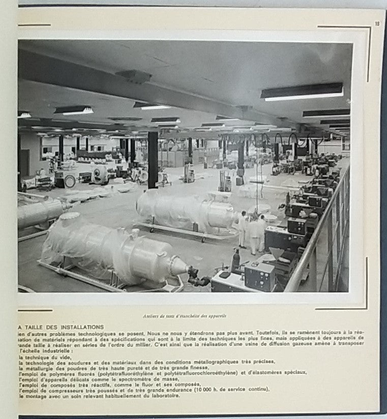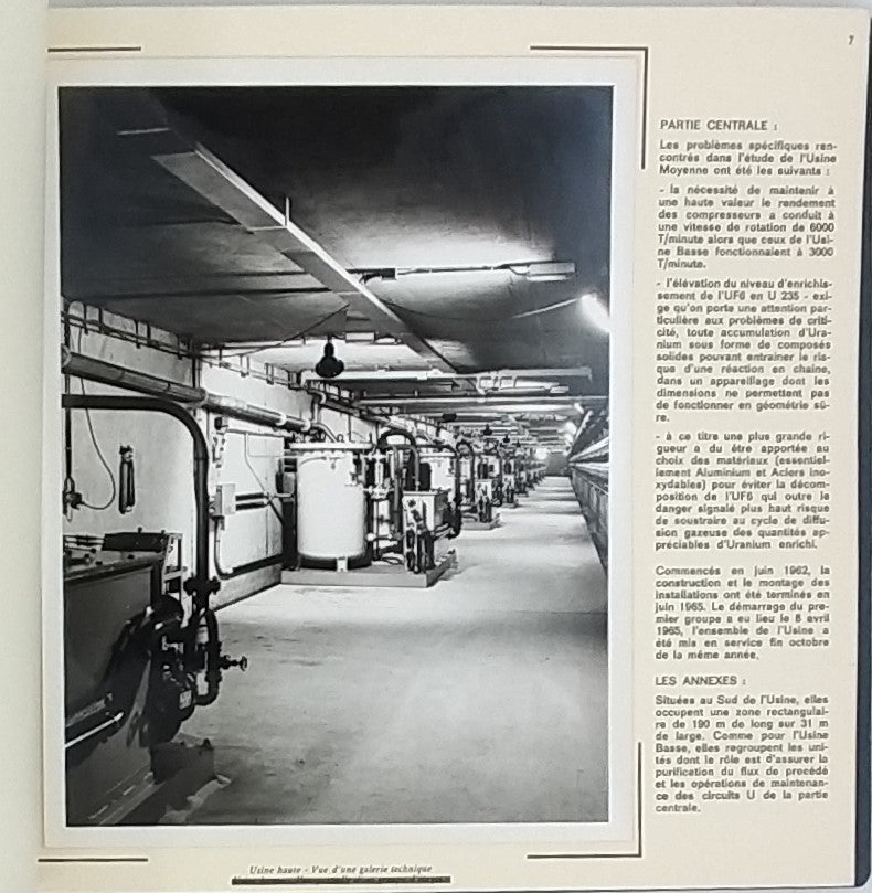 Ce document décrit l'usine d'enrichissement de l'uranium à des fins militaires de Pierrelatte. De 1960 à 1996 elle a produit de l'uranium enrichi à 90 % destiné à la fabrication d'armes nucléaires dans le cadre de la force de dissuasion nucléaire française. À partir de 1996 le démantèlement de l'usine a été entrepris. Il a été achevé en 2008. Sa construction a été décidée en 1958, les travaux débutèrent en 1960 et le premier lingot d'uranium faiblement enrichi fut obtenu en janvier 1960. Les personnes friandes de sensationnel seront déçues car la lecture de ce document ne révèle rien de "sensible" quand aux technologies utilisées : il est d'ailleurs impressionnant de constater le talent de ses rédacteurs qui ont su présenter l'usine en 27 pages et 25 belles photographies sans rien en dévoiler d'important !