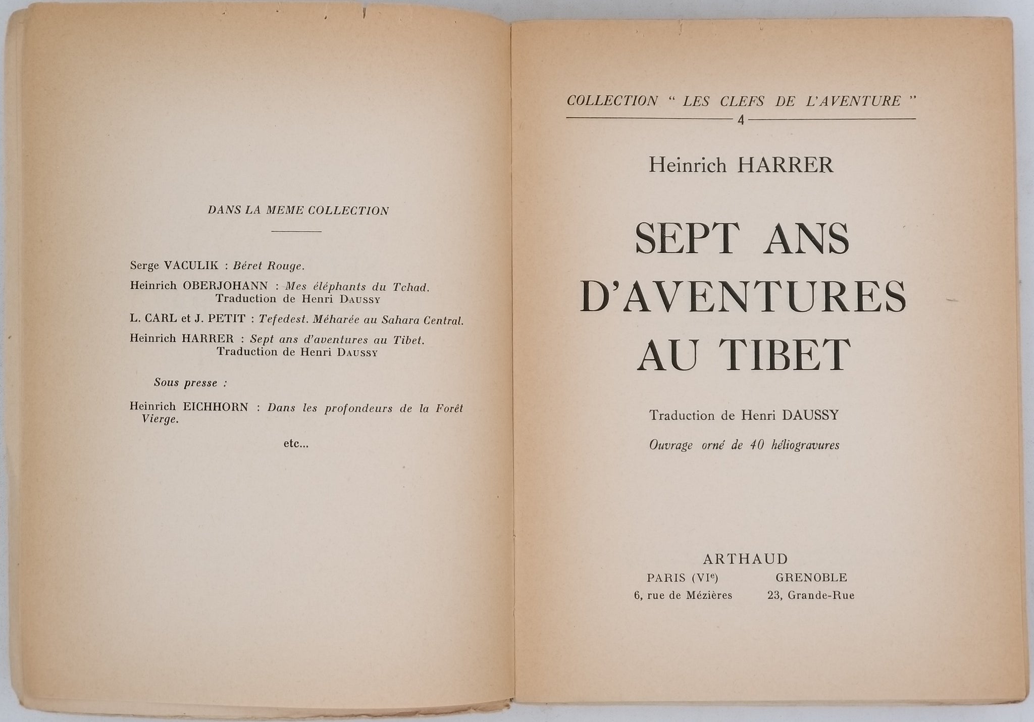 in-8 (16 x 21 cm). Brochage de l'éditeur avec couverture et dos imprimés du titre en bistre. Salissures et petites pertes de papier à la couverture. 275 pages, 40 héliogravures en noir à pleine ou double pages et une carte dépliante en fin de volume donnant l'itinéraire de H. Harrer ; 4 pages non chiffrées en fin de volume donnant le catalogue de l'éditeur. Papier jauni. Exemplaire non rogné. Bon exemplaire.