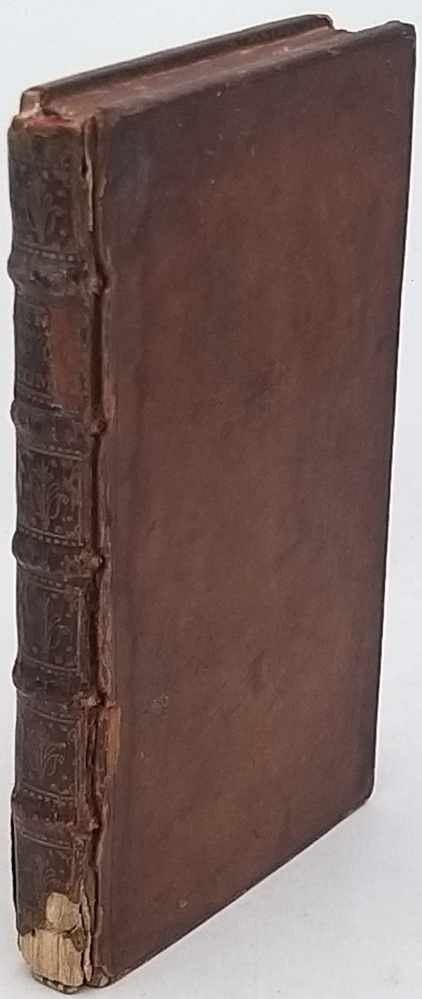 in-12 (10 x 16,5 cm). Reliure plein cuir glacé havane avec d'importants accidents. Roulette dorée à l'intérieur des plats et sur les coupes. Toutes tranches rouges. Mors du premier plat entièrement fendu mais encore solide. Mors du deuxième plat fendu en tête sur environ 1 cm et en pied sur environ 6 cm. Coins légèrement émoussés. Dos à 5 nerfs avec fleurons dorés dans les caissons. Important manque de cuir en pied du dos sur environ 2 cm. Coiffe et pied arrasés. Environ la moitié de la pièce de titre a disparu. Titre doré. 8 pages (Titre, Table des chapitres, Privilège du Roy, 152 pages pour le texte des Maximes et 7 pages (avec une nouvelle pagination) pour la Profession de Foy. Papier jauni avec de rares taches et rousseurs. Bel exemplaire malgré les défauts signalés.