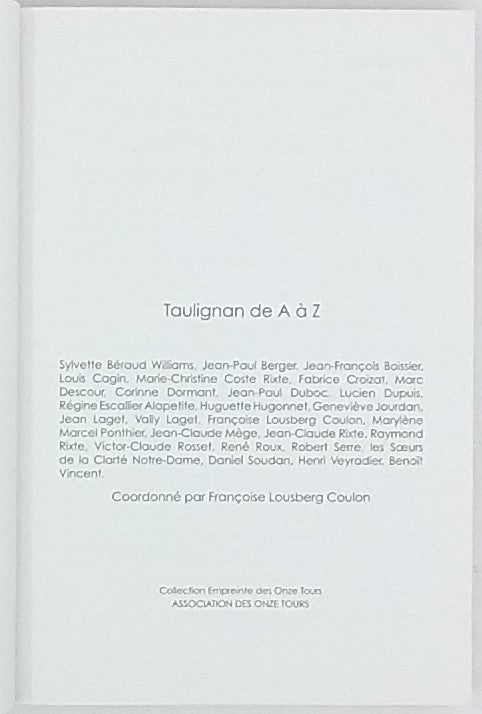 Présentation de l'éditeur en dernière de couverture : "Pour ce 6e volume d’Empreinte des Onze tours, Taulignan est passé au crible de spécialistes, d’amateurs éclairés ou de gardiens d’une mémoire. 27 auteurs se sont penchés sur Taulignan fouillant archives et documents, arpentant le territoire, mesurant les édifices, analysant sol, sous-sol et terrains, décryptant histoire et personnages. Taulignan de A à Z offre à la lecture la somme des connaissances actualisées sur la cité aux 11 tours. Grâce à la forme attrayante de l’abécédaire, vient naturellement l’envie de piocher çà et là des pans de la vie du bourg médiéval, envie accrue par la fréquence des illustrations. Des informations et plans inédits viennent satisfaire les plus curieux de ce village aux multiples facettes."