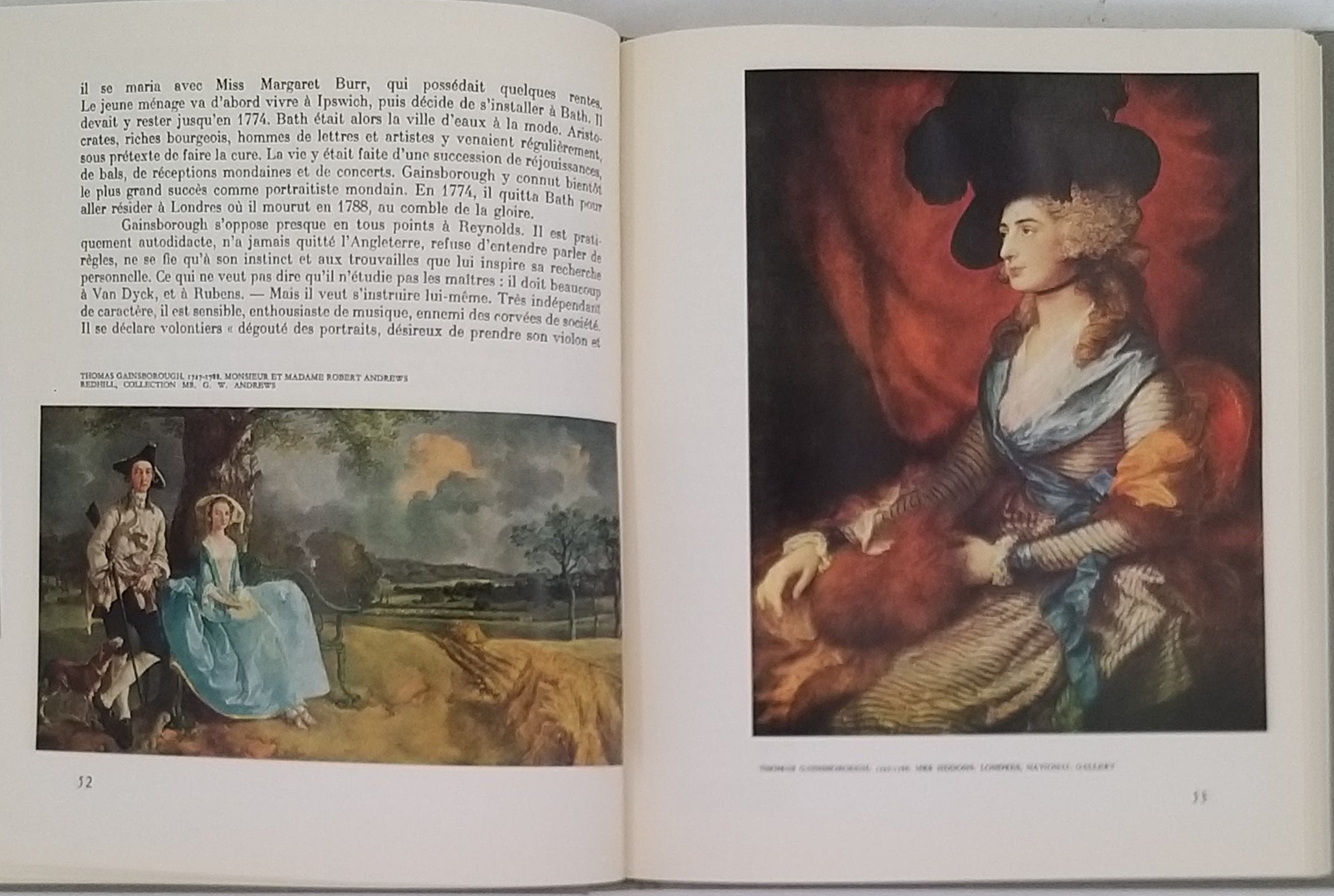 in-8 carré (20 x 24,5 cm pour l'emboîtage). Cartonnage rigide éditeur à la Bradel toilé gris sous un emboitage toilé gris. Dos lisse avec titre doré. Premier plat avec titre doré et orné d'une reproduction en couleurs ("M. et Mme Robert Andrews" de Gainsborough) contrecollée. 159 pages (les deux dernières non chiffrées) avec de nombreuses reproductions en couleurs contrecollées in et hors texte (complet). Bon exemplaire.