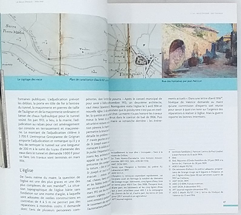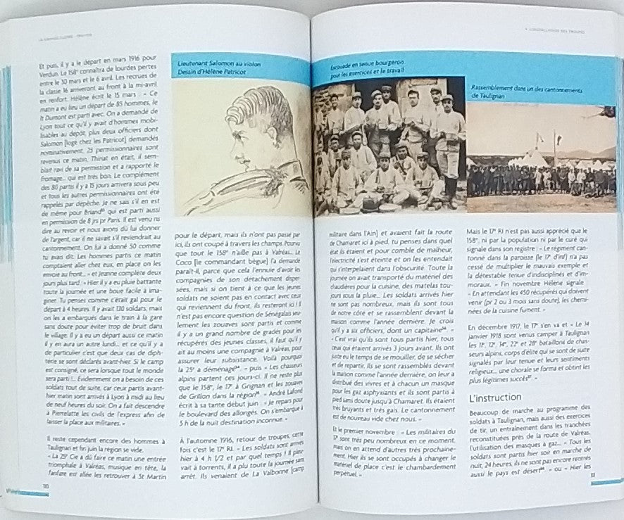 Présentation de l'éditeur en dernière de couverture : "Taulignan, village rural de 2082 habitants, commence le siècle riche de son industrie de la soie florissante. La Grande Guerre change la donne. Comme d’autres dans la région, le village sert de cantonnement à des troupes en instruction. Un atelier fabrique des obus, l’école des garçons devient hôpital. Le bourg vit à l’heure militaire avec ses anecdotes et ses contraintes. Les hommes partis à la guerre, l’entraide s’organise. On collecte pour les œuvres et on accueille des réfugiés. Pénuries et grippe espagnole pèsent sur la bourgade qui peine à retrouver son souffle malgré la fin des hostilités. Les progrès techniques arrivent, l’industrie change, la production agricole aussi mais le village a perdu un tiers de sa population. À partir de documents originaux de familles taulignanaises, de dossiers des Archives départementales, de nombreuses correspondances d’époque et du journal des curés, l’auteure retrace l’histoire de 1906 à 1926 aux confins de la Drôme et du Vaucluse."